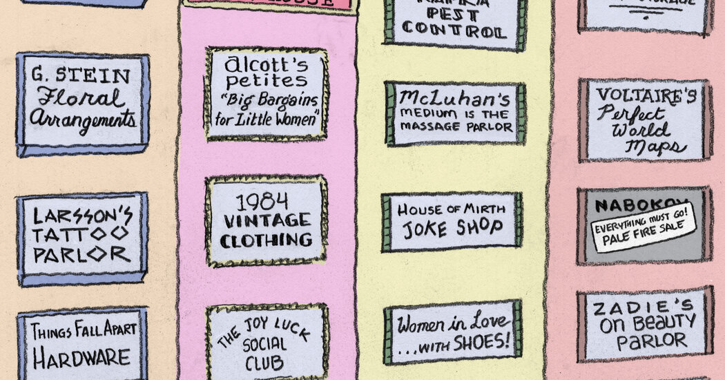 How many books and authors can you identify in this drawing? Hint: it’s not just the signs that are allusion to literature. Which jokes can you explain?